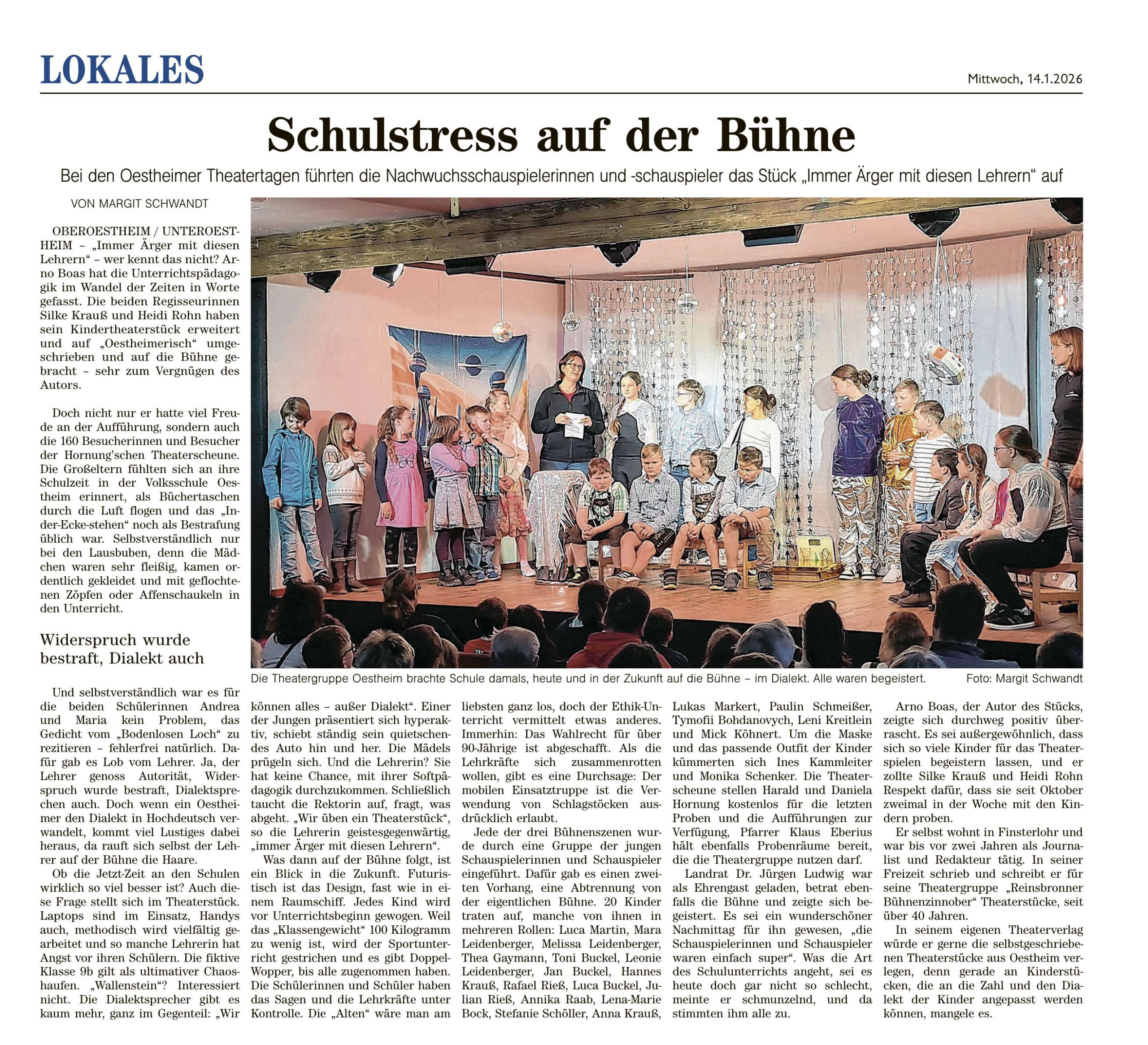 Mit dem Stück „Immer Ärger mit diesen Lehrern“ von Arno Boas eröffnete die Nachwuchstheatergruppe des Männergesangvereins Oestheim 1910 e.V. am 10. und 11. Januar die Theater Saison 2026. An den beiden restlos ausverkauften Vorstellungen gaben die 20 jungen Schauspieler und Schauspielerinnen im Alter von 7 bis 13 Jahren ihr Können zum Besten und durften als besondere Zuschauer neben dem Autor des Stückes auch Landrat Dr. Jürgen Ludwig im Publikum begrüßen.